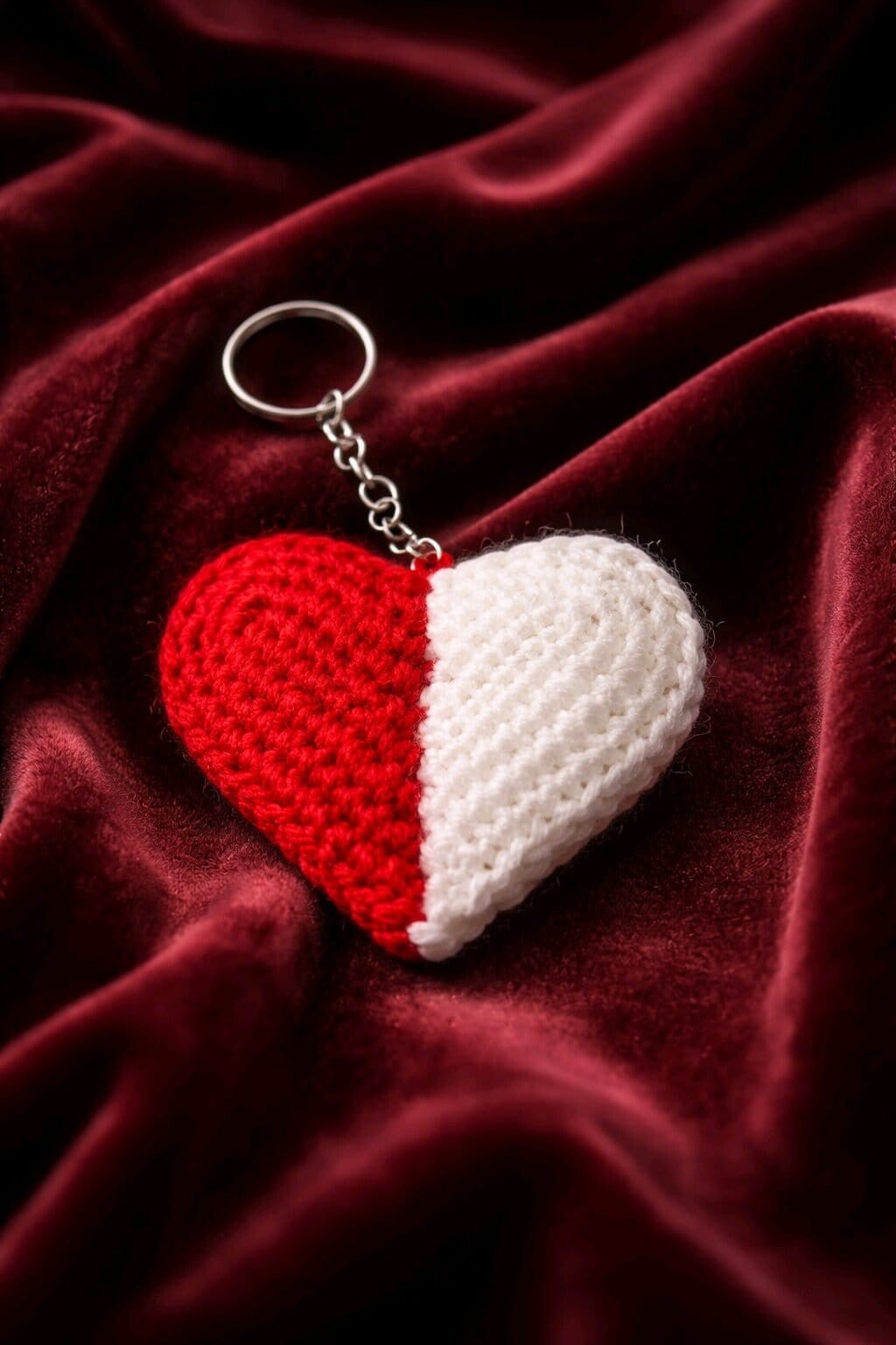 Ein Herz mit Charakter – dieser gehäkelte Schlüsselanhänger in auffälligem Halb-Weiß, Halb-Rot-Design ist ein echter Hingucker und das perfekte Accessoire für Schlüsselbund, Tasche oder Rucksack. In liebevoller Handarbeit gefertigt, misst das Herz ca. 9 × 7 cm und liegt angenehm in der Hand. Der metallene Schlüsselring sorgt für einfache Befestigung und sicheren Halt.