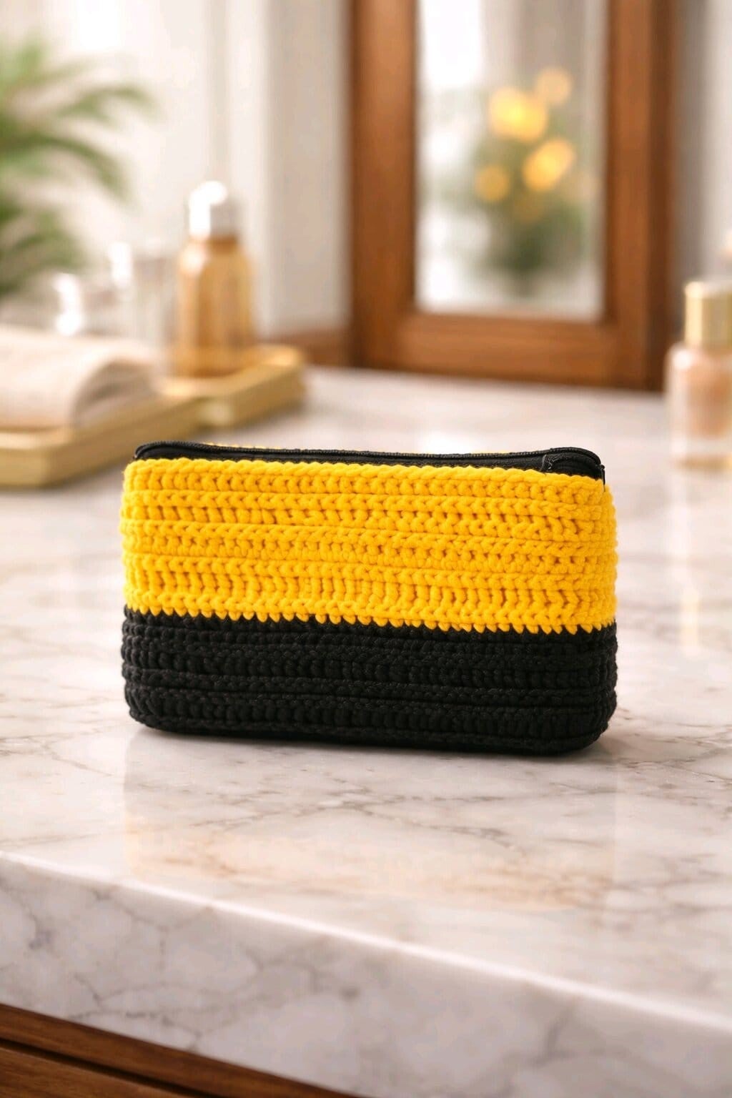 Diese liebevoll gehäkelte kleine Tasche in den kräftigen Farben Schwarz und Gelb ist der ideale Begleiter für Alltag und Freizeit. Mit den Maßen von 24,5 × 16,5 cm bietet sie genug Platz für Kosmetik, Handy, Geldbörse, Schlüssel oder andere Kleinigkeiten – sicher verschlossen durch einen Reißverschluss.