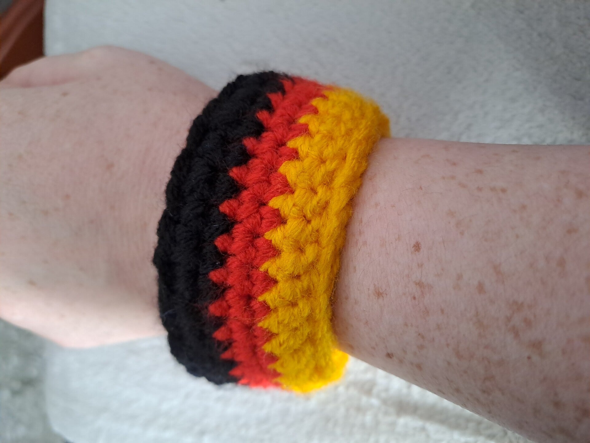 Dieses handgehäkelte Armband in den Farben Schwarz, Rot und Gold ist ein ausdrucksstarkes Accessoire für Fans regionaler Verbundenheit und klarer Farbstatements. Mit einer Länge von 26 cm und einer Breite von 4 cm bietet es eine angenehme Präsenz am Handgelenk – ohne aufzutragen. Dank des integrierten Gummibands passt es sich flexibel jeder Handgelenksgröße an und sitzt bequem, ohne zu drücken.