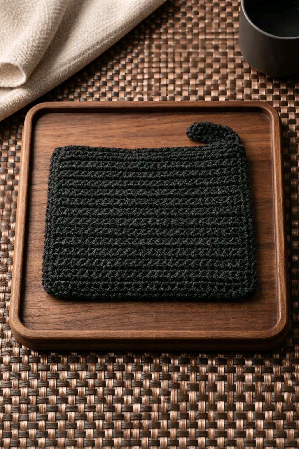 Dieser handgehäkelte Topflappen in tiefem Schwarz ist ein eleganter Küchenhelfer mit klarer Linie. Mit seiner Größe von 20 × 20 cm bietet er zuverlässigen Schutz beim Kochen und Backen – ob als Griffschutz, Untersetzer oder stilvolles Accessoire. Die gleichmäßige Häkelstruktur sorgt für angenehme Griffigkeit, und die praktische Aufhängeschlaufe macht ihn jederzeit griffbereit.