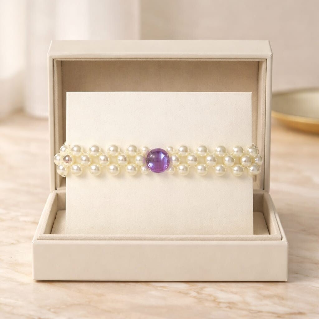 Dieses handgefertigte Armband ist die perfekte Ergänzung zur „Viola“-Kollektion. Zwei Reihen aus elfenbeinfarbenen Perlen bilden ein elegantes Muster, verbunden durch feine Zwischenperlen in transparenter Optik. Im Zentrum strahlt eine große, glänzende Perle in intensivem Lila – ein stilvoller Akzent, der dem Armband Charakter und Tiefe verleiht.