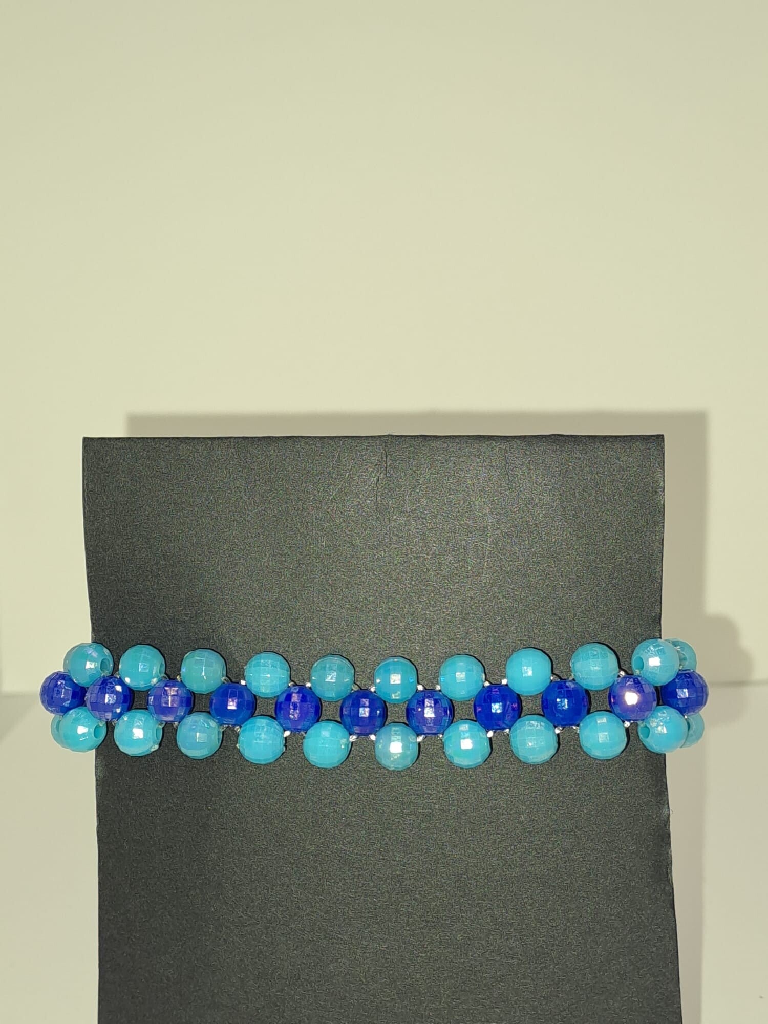 Dieses handgefertigte Armband besticht durch seine freundliche und helle Farbwirkung. Die überwiegenden hellblauen Kunststoffperlen verleihen dem Schmuckstück eine luftige, sanfte Ausstrahlung. Dunkelblaue Perlen setzen dezente Akzente und sorgen für Tiefe im Design, ohne die Leichtigkeit zu überlagern. Ein harmonisches Accessoire, das Frische und Eleganz vereint.