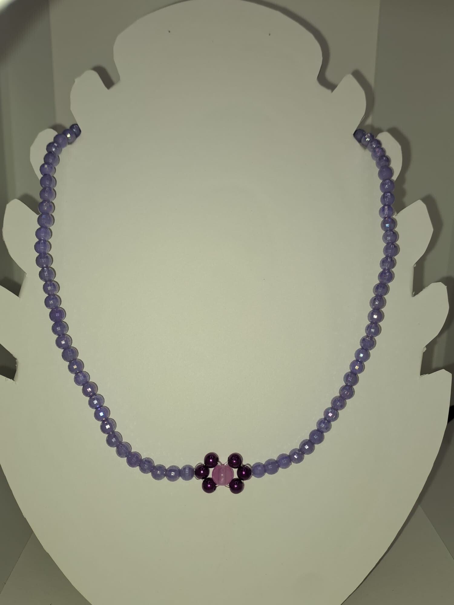 Diese handgefertigte Kette vereint sanfte Farbigkeit mit einem ausdrucksstarken Detail. Kleine, transparente Kunststoffperlen in hellem Flieder-Lila bilden die Basis und verleihen dem Schmuckstück eine leichte, träumerische Ausstrahlung. Im Zentrum setzt ein florales Arrangement aus sechs dunkellila Perlen rund um eine pinkfarbene Mittelperle einen verspielten Akzent – feminin, harmonisch und liebevoll gestaltet.