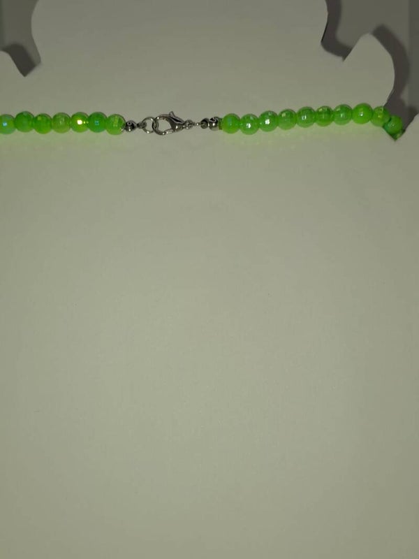 Diese handgefertigte Kette bringt die Leuchtkraft des Frühlings und die Tiefe des Waldes zusammen. Kleine, transparente Kunststoffperlen in hellem Grün bilden die Basis und verleihen dem Schmuckstück eine frische, lebendige Ausstrahlung. Im Zentrum setzt ein geometrisch angeordnetes Cluster aus dunkelgrünen Perlen einen ruhigen Kontrast – wie ein Blatt im Lichtspiel des Waldes.